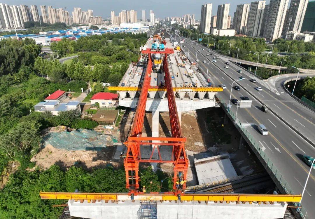上跨架梁施工风险大,为确保万无一失,山东济铁工程建设集团有限公司精心组织,科学施工,前期精心编制施工方案、施工计划,8月5日完成了第1跨施工。施工过程中,工作人员用运梁车将箱梁运送至施工地点,架桥机将每片长40米、重达170吨的箱梁缓缓平移,并平稳地架设在桥梁支座上,整个施工过程配合默契,井然有序。