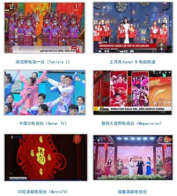 截至2月10日,国际视频通讯社精心编译的总台龙年春晚相关视频被BBC、CNBC、美国全美电视台、美国ODK Media、美国第二大西班牙语电视网Telemundo、法国24台、加拿大最大商业电视网CTV、意大利广播电视公司、俄罗斯第一频道、全俄国家电视广播公司、西班牙电视六台、印度全印电视台、卡塔尔电视台、越南国家电视台、韩国阿里郎电视台、印尼美都电视台、巴西旗手电视台、委内瑞拉南方电视台、洪都拉斯国家电视台、南非德班电视台、摩洛哥电视台、澳大利亚广播公司、瑙鲁国家电视台等70个国家和地区的193家电视台及新媒体平台转播和报道599次,覆盖国家和地区数量比去年同期增长25%。