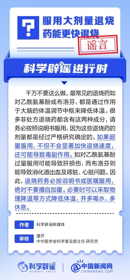最常见的退烧药如对乙酰氨基酚或布洛芬,都是通过作用于大脑的体温调节中枢来降低体温。这些退烧药的剂量都是经过严格研究确定的。如果超量服用,不但不会显著加快退烧速度,还可能导致毒副作用。如对乙酰氨基酚过量服用可能导致肝损伤,而布洛芬则能导致消化道出血及肾脏、心脏问题。(来源:@科学辟谣 @中国新闻网 )