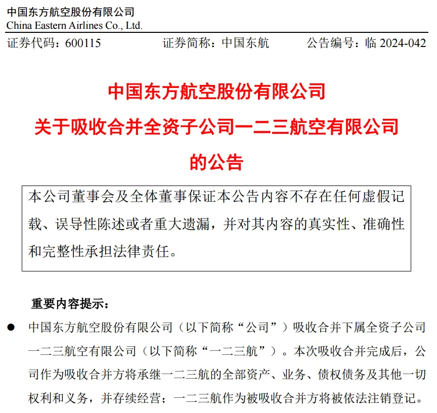 9月22日,中国东航发布了《关于一二三航旅客客票特殊处理的通告》,自9月22日起,中国东航与一二三航空有限公司(简称“一二三航”)合并运行。