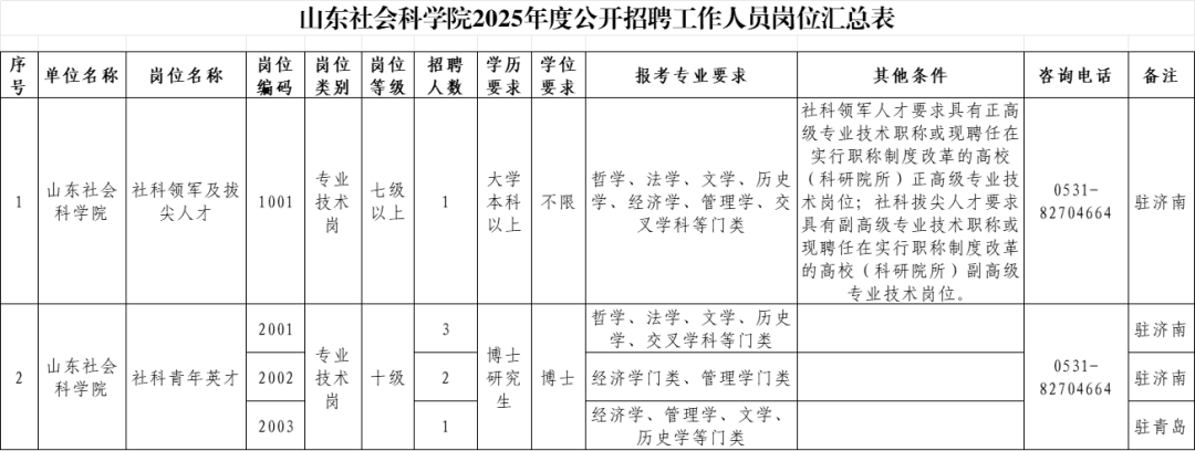 山东社会科学院 招聘岗位及人数 拟面向社会公开招聘高层次人才1名以及优秀博士研究生6人,具体岗位及条件详见《山东社会科学院2025年度公开招聘工作人员岗位汇总表》。 点击图片查看具体招聘岗位 报名时间 社科领军人才、拔尖人才岗位为长期招聘岗位,自本信息发布之日起开始报名,第一阶段报名截至2025年3月31日,岗位招满即止,未招满的岗位报名有效期至2025年12月31日; 社科青年英才岗位自信息发布之日起截至2025年3月31日。 报名方式 应聘人员通过电子邮件形式报名。报名材料按要求以压缩包方式发至电子邮箱sdskyzp@shandong.cn,附件一般不超过5MB,以“岗位名称及编码-姓名”格式命名压缩包和邮件主题栏(例:社科青年英才2001-某某某),报名材料原件须在考试现场资格复审环节提供。 扫码查看更多招聘信息