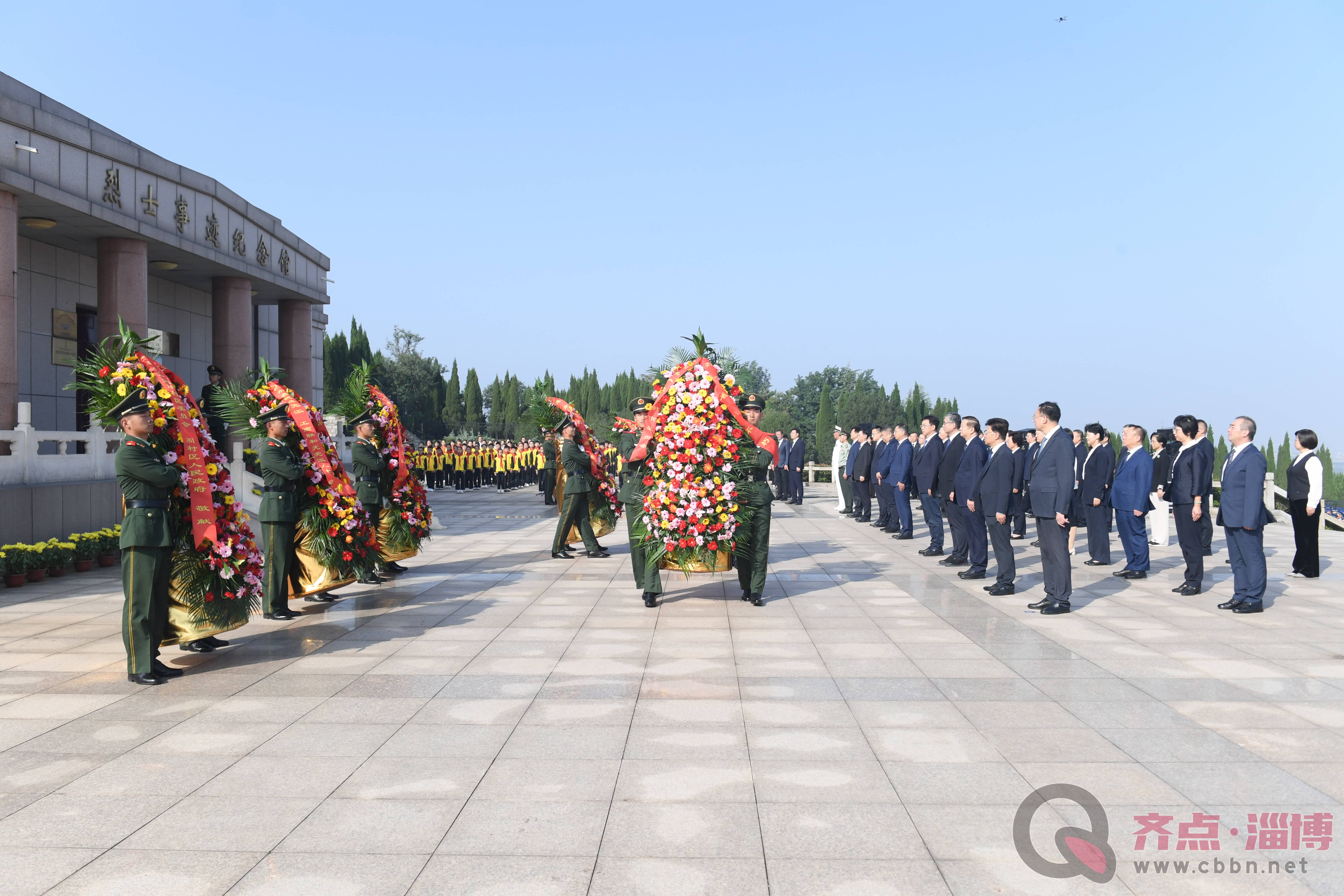 方阵前,摆放着由中共淄博市委,淄博市人大常委会,淄博市人民政府,淄博市政协,淄博军分区,驻淄部队和武警官兵,淄博市各民主党派、工商联和无党派人士,淄博市各团体、各界群众、中国少年先锋队淄博市工作委员会,中共周村区委、周村区人民政府分别敬献的9个花篮,花篮缎带上“烈士永垂不朽”金色大字熠熠生辉。