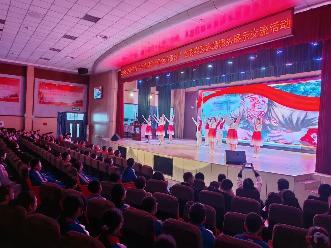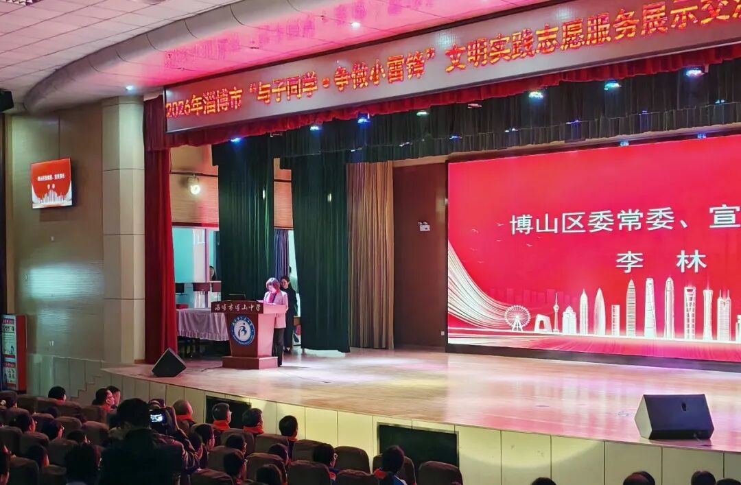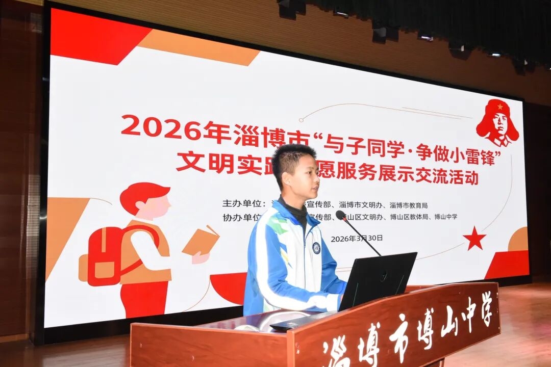 3月30日,2026年淄博市“与子同学·争做小雷锋”文明实践志愿服务展示交流活动在博山中学报告厅举行。