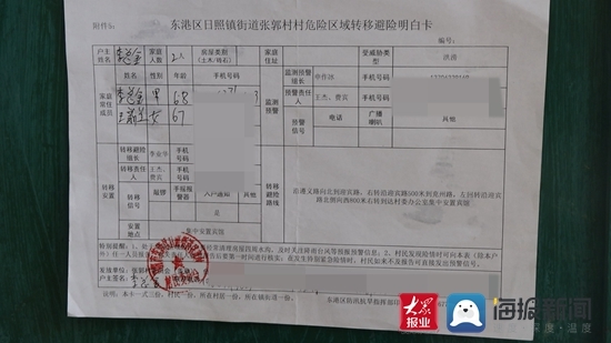 同样,在日照市张郭村村民的大门上,两张“村危险区域避险明白卡”和一张“张郭村防汛明白纸”也被贴在极为显眼的位置。几日前,台风“烟花”波及日照地区时,村民和住在这里的租户便是依照着“明白卡”上公开的避险路线被转移到安置点。