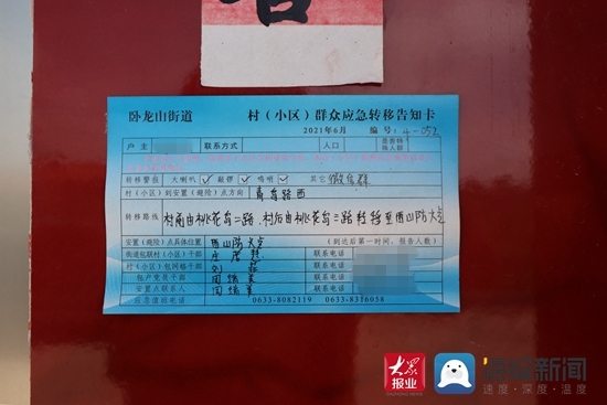 每到汛期,日照市山海天卧龙山街道路家村的村民都要时刻留心着村口大喇叭的通知,生怕漏掉水库涨水、通知村民转移的消息。今年,村民心里踏实多了,涨水后联系谁、转移到哪个地方才安全都清清楚楚。这些,得益于贴在村民家门口的一张“应急转移告知卡”。