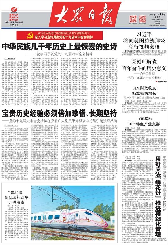 11月8日至11日,党的十九届六中全会在北京胜利举行。山东广大党员干部群众第一时间认真学习,深刻领会全会精神。大家一致表示,要把党的十九届六中全会精神与习近平总书记“七一”重要讲话精神和对山东系列重要讲话、重要指示批示精神结合起来,一体学习领会、整体贯彻落实,大力弘扬伟大建党精神,从党的百年奋斗历程中汲取前进的智慧和力量,以史为鉴、开创未来,为实现第二个百年奋斗目标、实现中华民族伟大复兴的中国梦而不懈奋斗。
