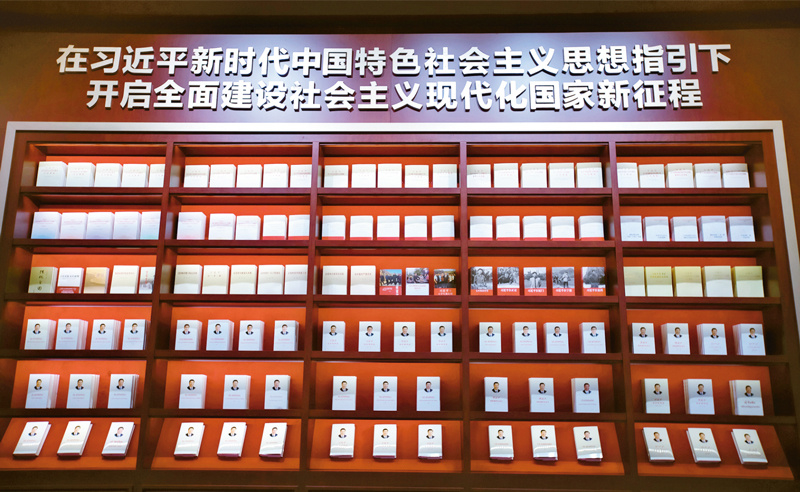 习近平新时代中国特色社会主义思想是当代中国马克思主义、二十一世纪马克思主义,是中华文化和中国精神的时代精华,实现了马克思主义中国化新的飞跃。图为中国共产党历史展览馆展出的习近平总书记的部分重要著作以及学习阐释习近平新时代中国特色社会主义思想的部分重点图书。 刘新武/摄