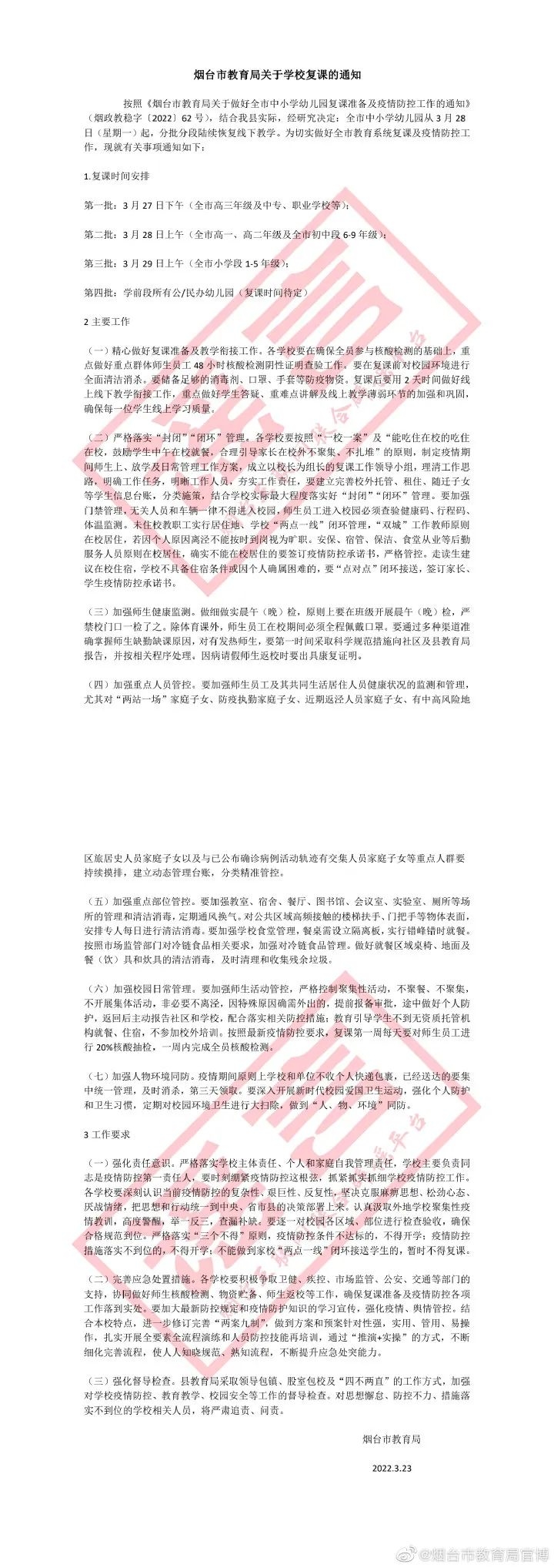 近日,微信群里流传的《烟台市教育局关于学校复课的通知》,引发家长关注。经核查,烟台市教育局未发该通知,特此辟谣。