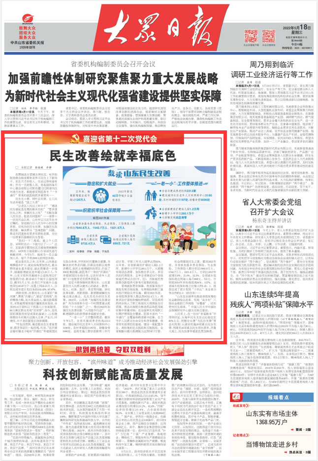 奋进新征程,建功新时代。山东省第十二次党代会即将召开,大众日报及客户端推出“喜迎省第十二次党代会”专栏,聚焦山东在科技创新、区域发展、生态环保、社会治理等方面的亮点、突破点,讲好新时代山东故事,汇聚强省建设磅礴力量。今天刊发《民生改善绘就幸福底色》——