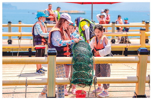 游客在爱伦湾国家级海洋牧场海上平台游玩。(李信君摄) |