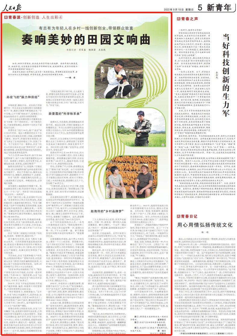 本版今天推出年轻人在乡村一线创新创业、带领群众致富的故事,看他们如何以火热的激情、科学的态度,奏响美妙的田园交响曲。