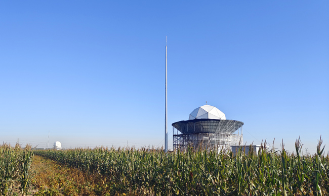 4部雷达有规律地分散在田间,居中1部是相控阵雷达,分散在外围的3部是多极化雷达,它们组成 “雷达矩阵”,对经过的迁飞害虫进行精准监测。