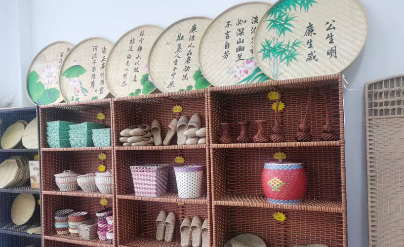 草编工艺加工专业合作社内的编织样品展示。新华网发(秦来玲 摄)