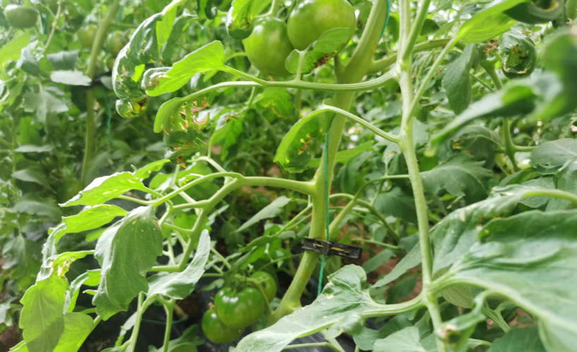 国科学院地理科学与资源所助理研究员刘振正在大棚里查看西红柿的长势。新华网发(秦来玲 摄)