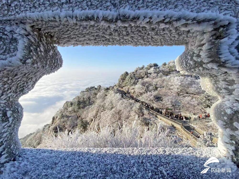 雾凇挂满山崖,宛如进入仙境。树木换上了美轮美奂的霓裳羽衣,树树凇花云叠,在风的吹拂下翩翩起舞。