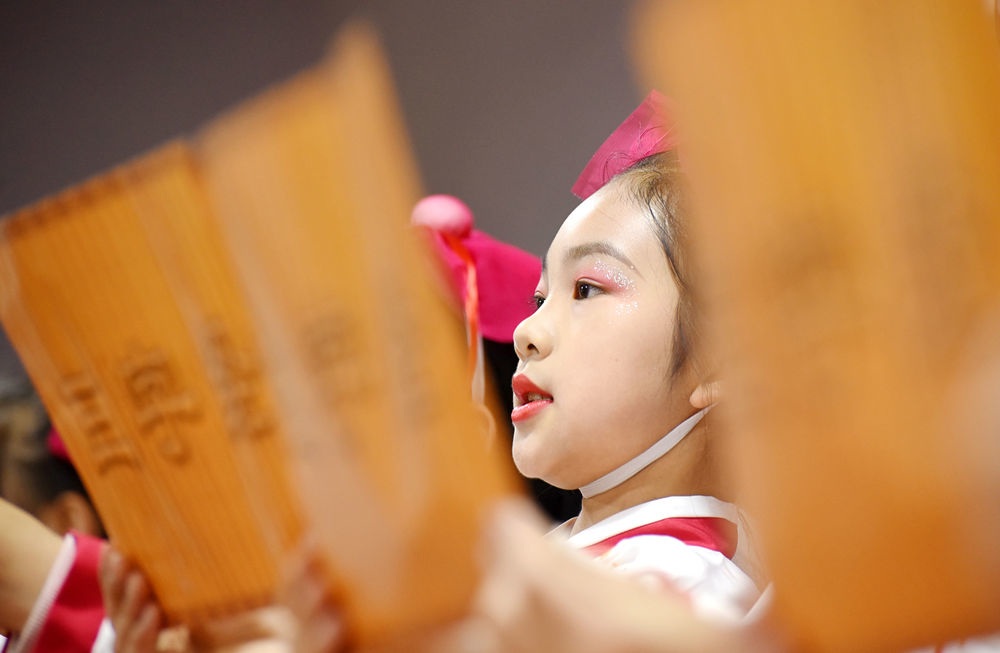 4月23日,山东省淄博市沂源县南麻街道中心小学的学生们参加集体经典诵读活动。新华社发(赵东山 摄)