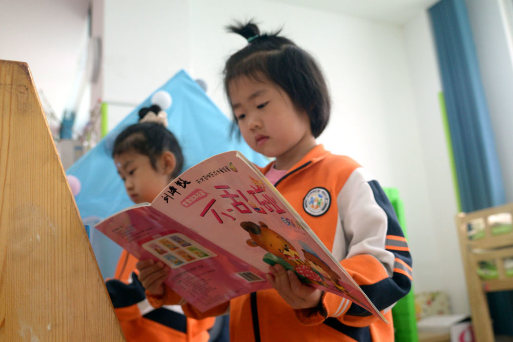 4月23日,山东省滨州市高新区第一教育幼儿园大班的小朋友在教室阅读绘本。新华社发(张春峰 摄)