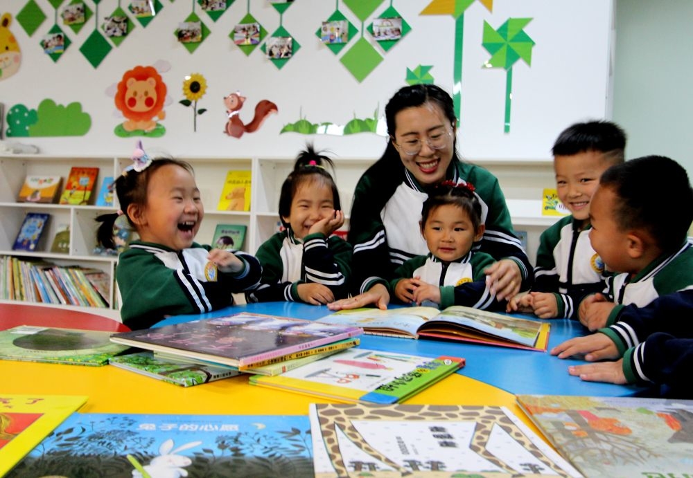 4月23日,在山东省烟台市福山区鲁东园艺场,第二实验幼儿园的小朋友和老师一起阅读绘本。新华社发(孙文潭 摄)