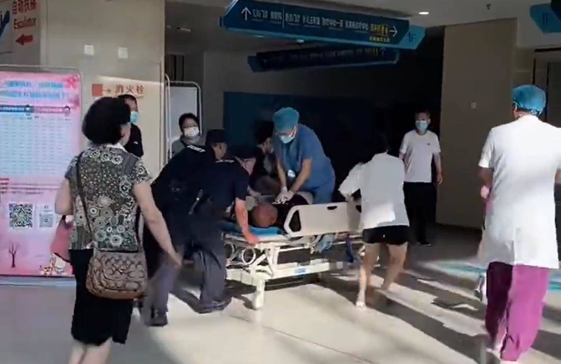 事发时,医护人员和医院保安合力将晕倒男子抬上担架车,紧急转运途中,一名医护人员直接跃上担架车,对病患进行心肺复苏抢救,过往的路人也纷纷让出了一条生命通道。