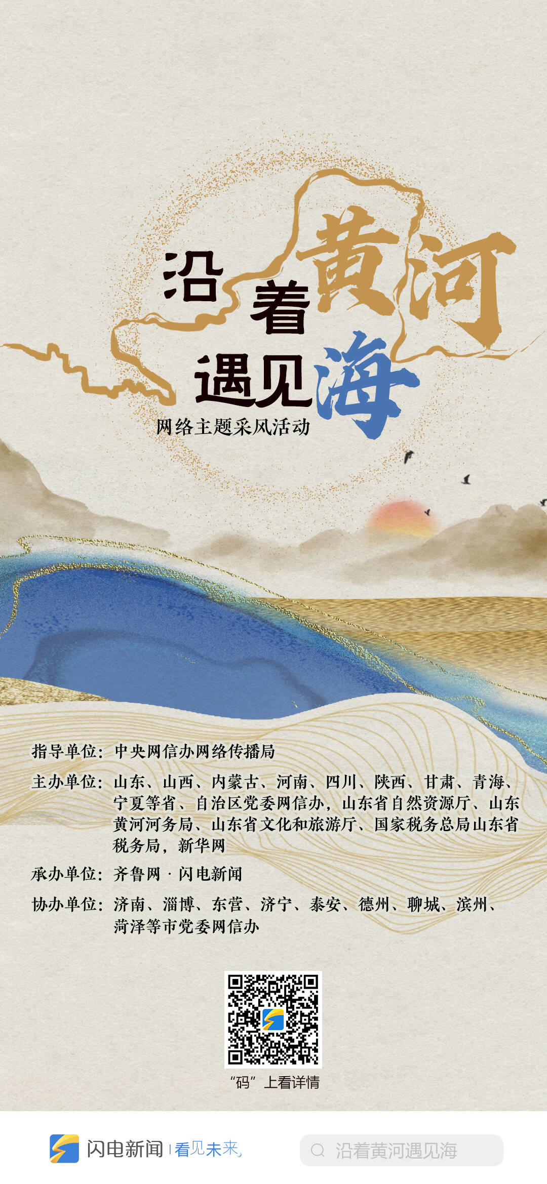 黄河落天走东海,万里写入胸怀间。由中央网信办网络传播局指导,山东等沿黄九省(区)党委网信办,山东省自然资源厅、山东黄河河务局、山东省文化和旅游厅、国家税务总局山东省税务局,新华网共同主办,齐鲁网·闪电新闻承办的“沿着黄河遇见海”网络主题采风活动启动仪式将于10月9日在东营举办。启动仪式后在东营、滨州、济南开展为期3天的集中采访。