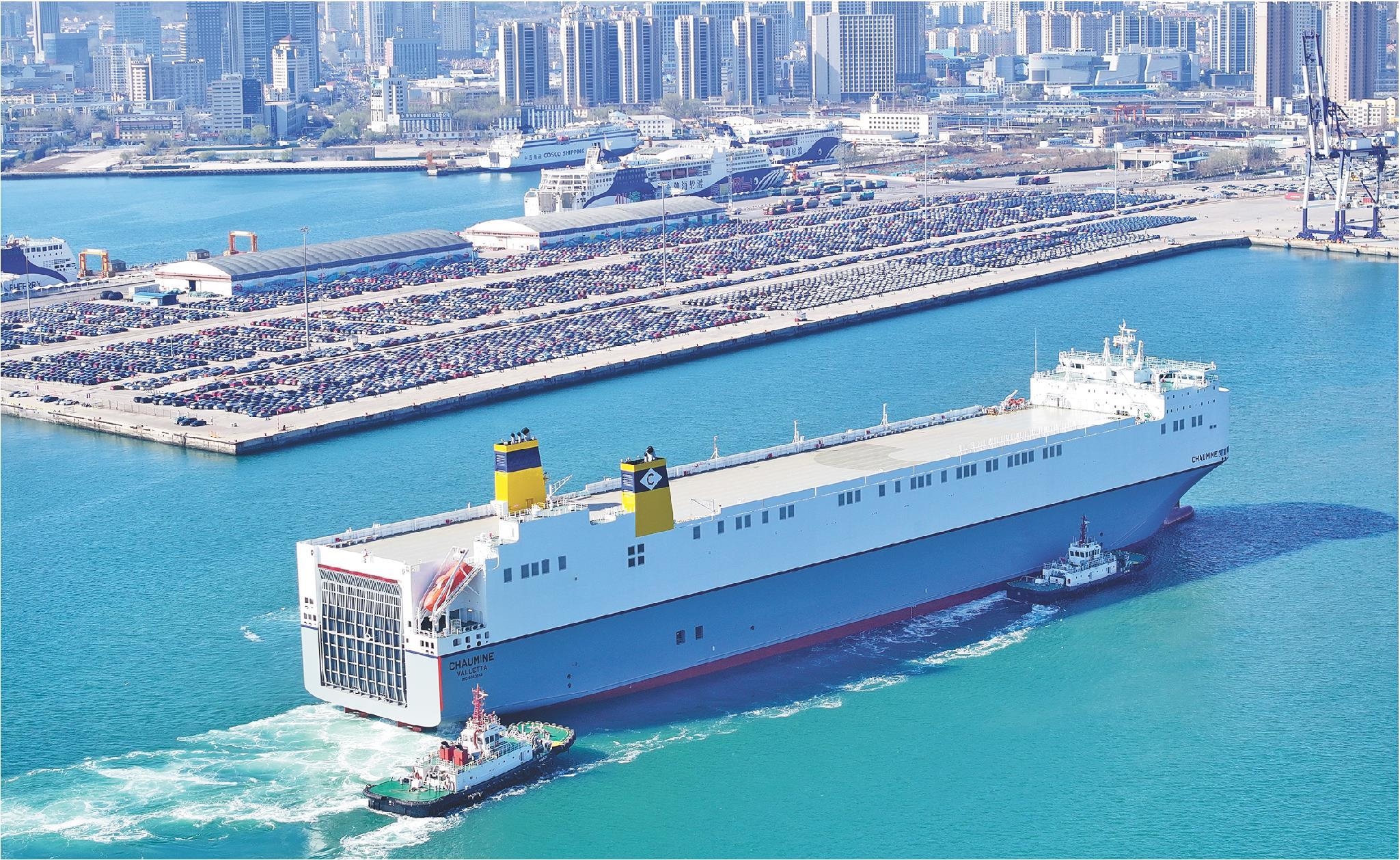 一艘商品车滚装船靠泊山东港口烟台港汽车码头,大量商品车等待出口发运。(□通讯员张超报道)