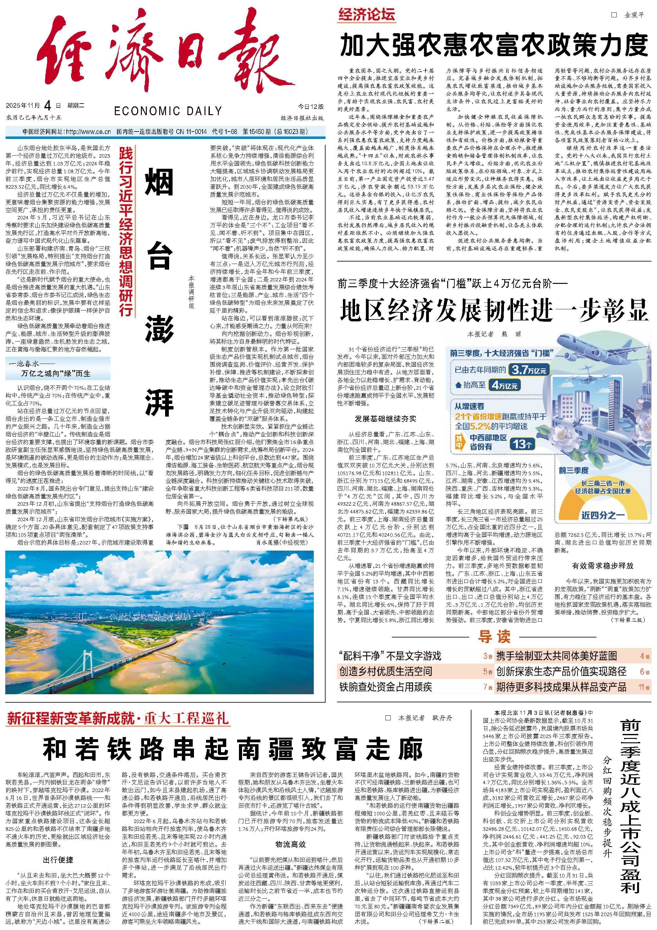 山东部署构建济南、青岛、烟台“三核引领”发展格局,特别提出“支持烟台打造绿色低碳高质量发展示范城市”,要求烟台在先行区走在前、作示范。
