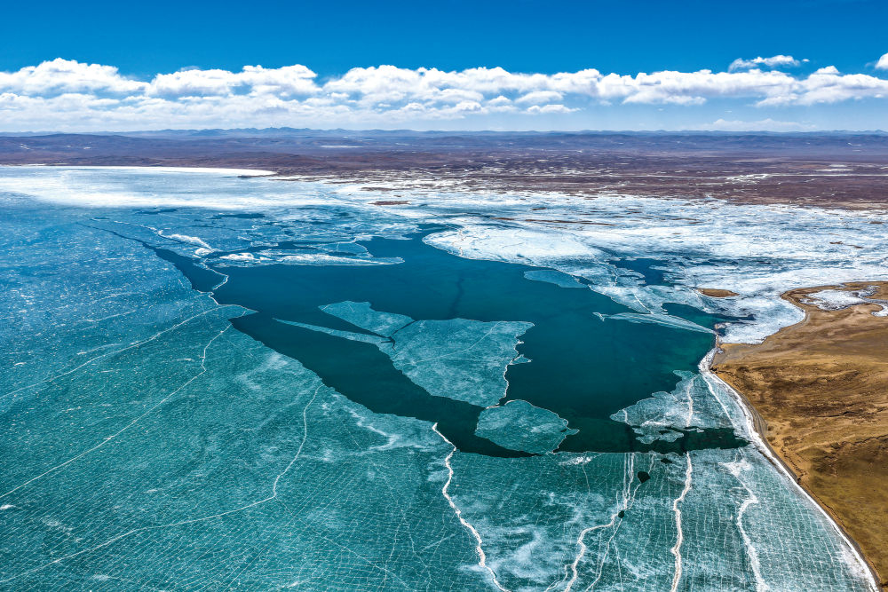 3月10日在青海省果洛藏族自治州玛多县境内拍摄的扎陵湖一角。初春时节,黄河源地区冰雪渐融。新华每日电讯记者张龙摄