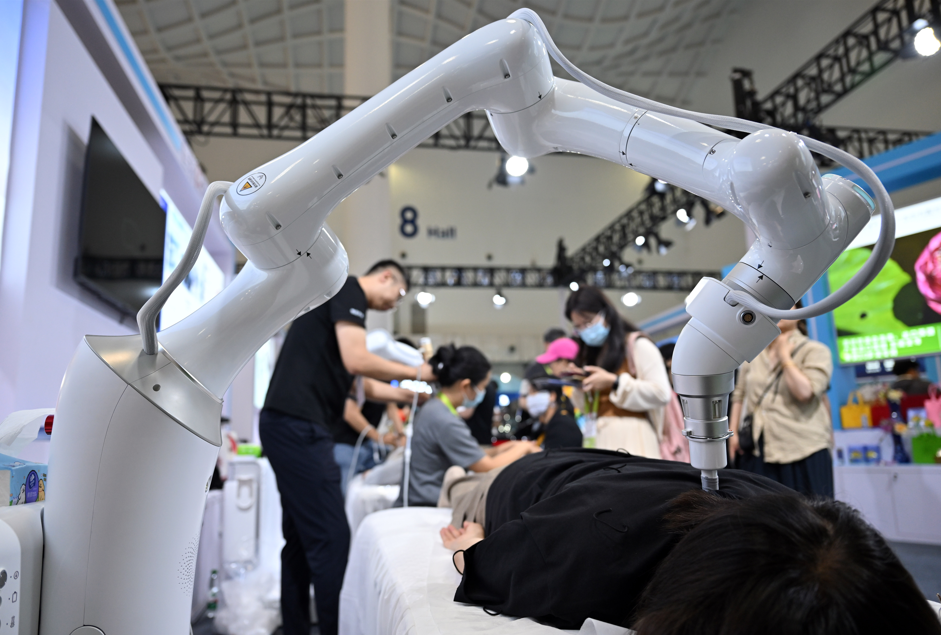 在第六届消博会山东展区,一台AI体质检测机器人前排起了队。来自潍坊的老字号企业黄元御生物科技有限公司,带来了这款能通过“看舌苔”分析体质、推荐食疗方案的设备。开展首日,企业总经理刘东峰就加了20多个客商的微信。