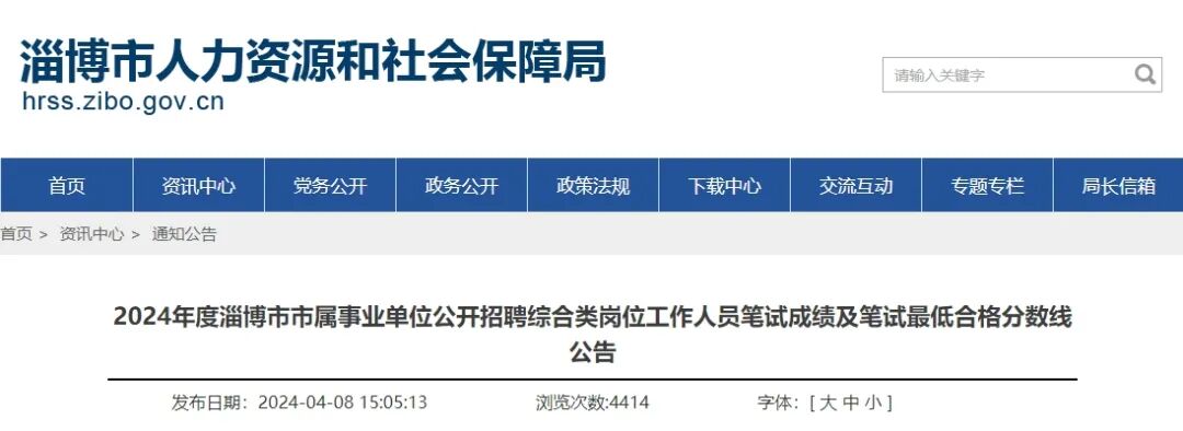 根据《2024年度淄博市市属事业单位公开招聘综合类岗位工作人员公告》有关规定,现对2024年度淄博市市属事业单位公开招聘综合类岗位工作人员笔试成绩进行公告(详见附件)。 结合应聘人数和考试情况,确定2024年度淄博市市属事业单位公开招聘综合类岗位工作人员笔试最低合格分数线为40分。 2024年淄博市市属事业单位公开招聘 综合类岗位工作人员笔试成绩↓↓ 扫码查看