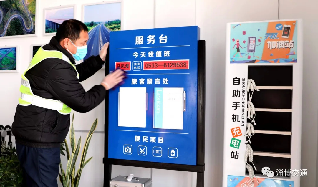 走进周家驿站,驿站工作人员引导客人进行扫码后介绍说,这里设有休息等区域,在多功能区还设置了手机快速充电站,常备医疗用品、雨伞等物品提供给驾乘人员使用,还有公共厕所、免费停车、交通路网指南等服务。