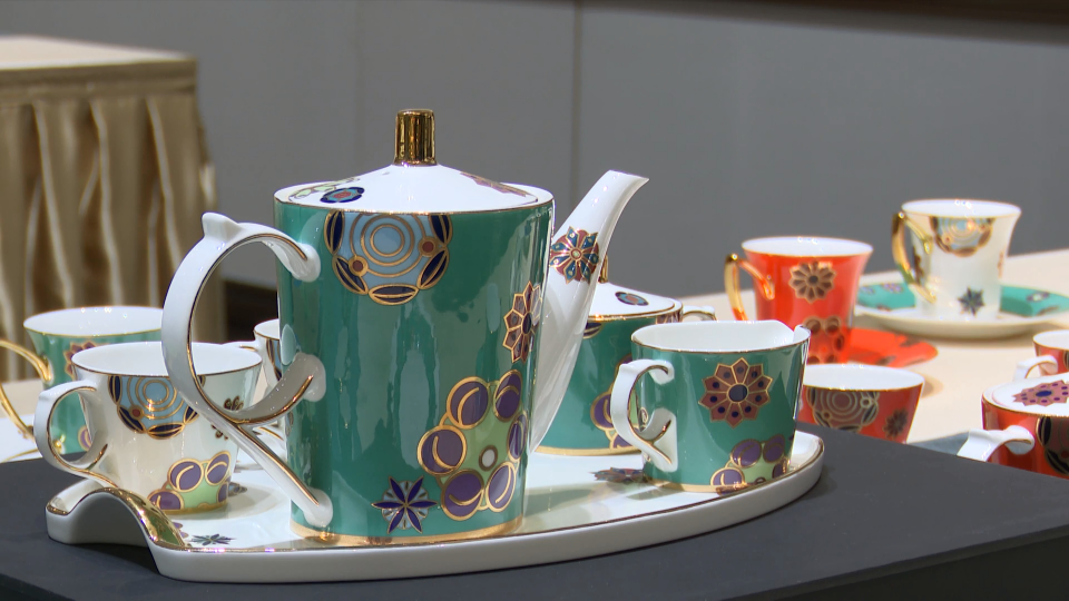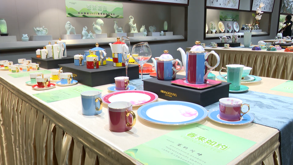 在华光国瓷艺术中心展厅里,1364件陶瓷全新亮相,这些陶瓷器型大气经典,融合高温釉中彩、手工描金、手绘艺术、浮雕为一体的画面装饰,既清新时尚,又高贵典雅。既有国潮范,又有国际派。