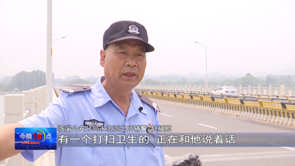 临淄公安分局永流派出所辅警 赵福顺:过来的时候,他在外头站着,下面有一个保安,有一个打扫卫生的,正在和他说着话,我们停下车以后,一边一个把他拉住了,拉住他以后,他说你松开我,我要跳下去,怎么劝也不听。这时过来了两个市民,我们四个把他给救上来了。