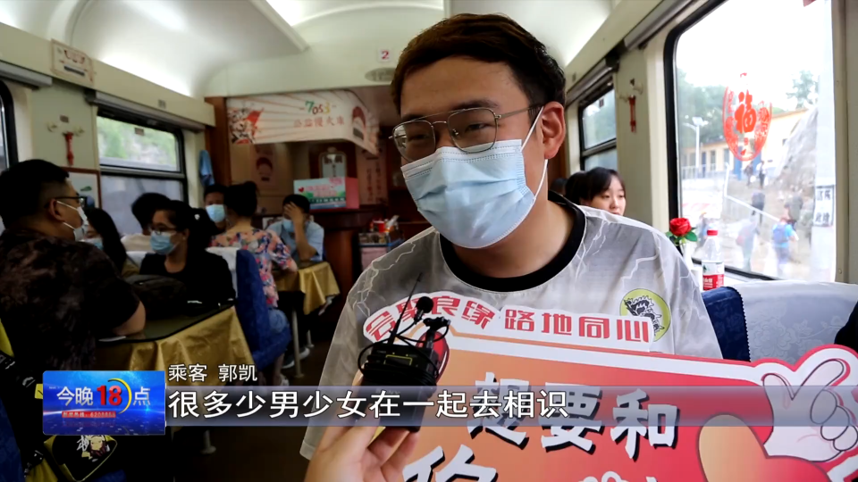 男青年 郭凯:7053是一个慢火车,但是其实今天来说,它也是一个很浪漫的车,在这个车厢里,很多少男少女在一起去相识,去寻找自己的缘分,然后,这个气氛也烘托得比较浪漫,真的是挺好的,就是工作以后,很难再有这样的场合,这个气氛也是很久违的一个气氛了。
