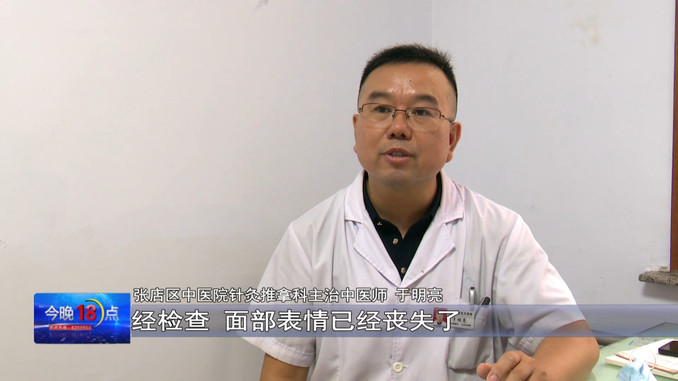 张店区中医院针灸推拿科主治中医师 于明亮:经过我们检查呢,他是因为前一天晚上吹空调时间过久,导致了他这个左侧的面部出现了面瘫,经检查,面部表情已经丧失了,而且呢还有面瘫的其他症状,比如耳朵疼痛啊等。