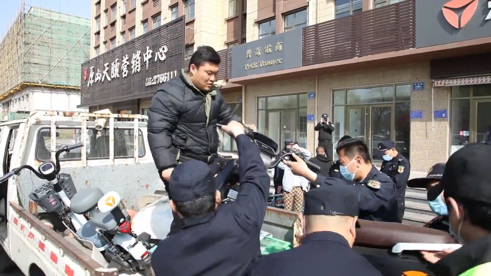 张店区综合行政执法局市容执法科科长 赵洪海:前期,各中队对辖区电动车自行车经营业户进行了摸排,同时下发了《致电动车自行车业户一封信》,有近60余家经营业户自行予以了整改,对尚未整改的业户下达了《责令限期整改通知书》,明确告知禁止占道经营、店外经营。今天是对下达《限期整改通知书》到期以后,仍然占道经营、店外经营拒不整改的业户,我们依法依规予以暂扣。