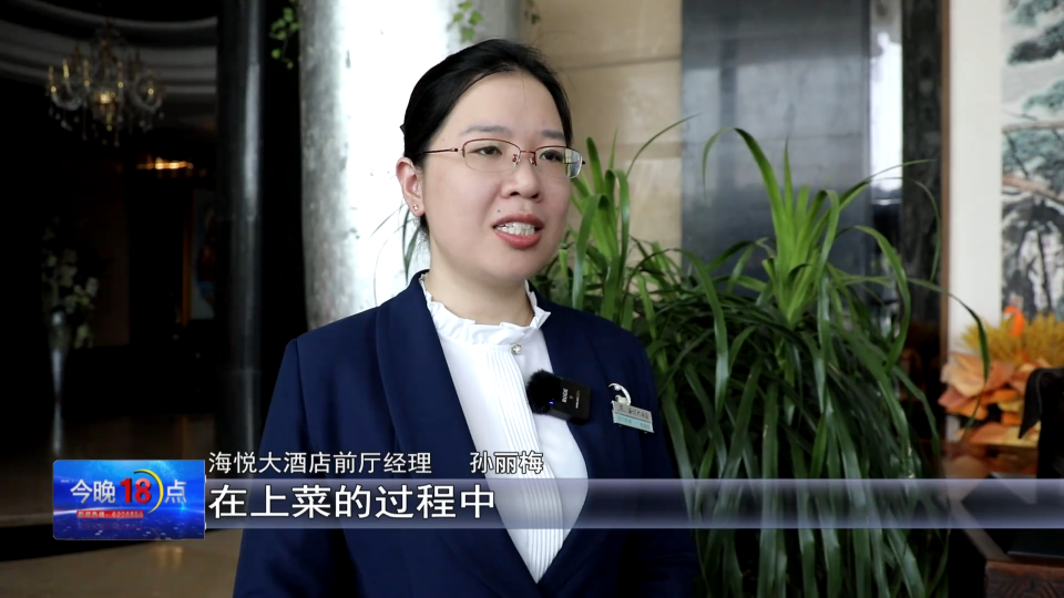 海悦大酒店前厅经理 孙丽梅:在上菜的过程中,每道菜品都会放公用勺和公用夹,让客人用得放心,在客人用餐结束后,我们服务人员会主动提醒客人是否需要打包服务。