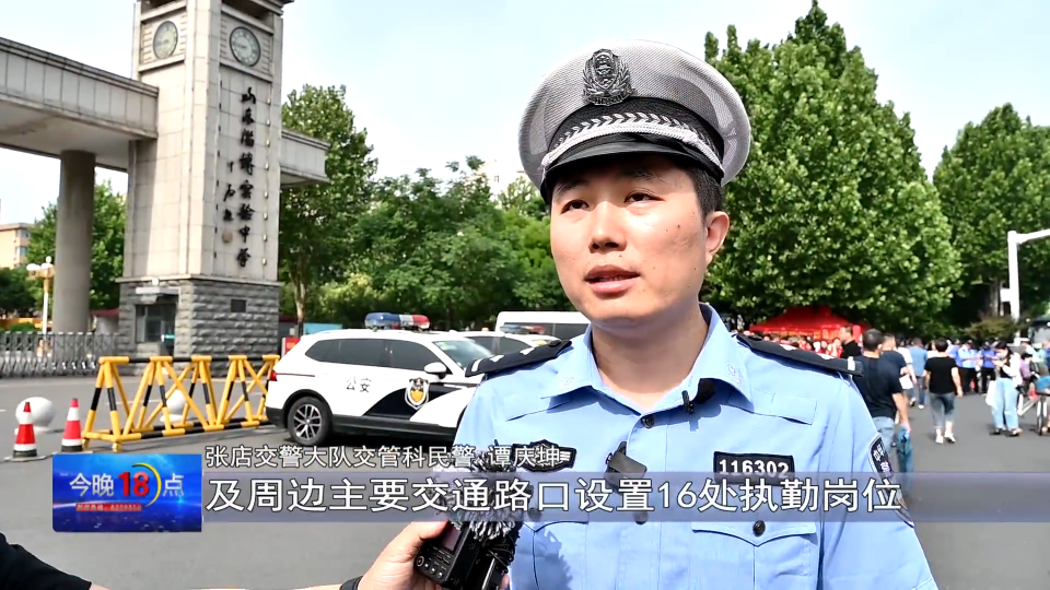 淄博张店交警大队交管科民警 谭庆坤:高考期间我们在市实验中学南门北门东门及周围主要交通路口设置16个执勤岗位,安排58名执勤人员,全体人员加强指挥疏导,确保考点周边路段畅通。