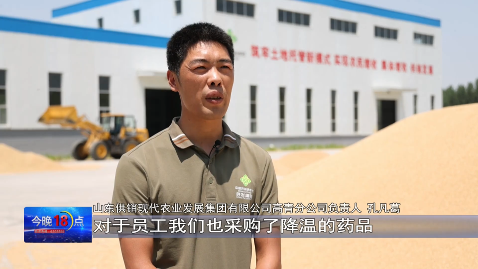 山东供销现代农业发展集团有限公司高青分公司负责人 孔凡葛:烘干基地也在24小时运转当中,减少路面晾晒道路安全的问题。对于员工我们也采购了降温的药品,后勤保障也有专人负责,确保“三夏”生产的顺利进行。