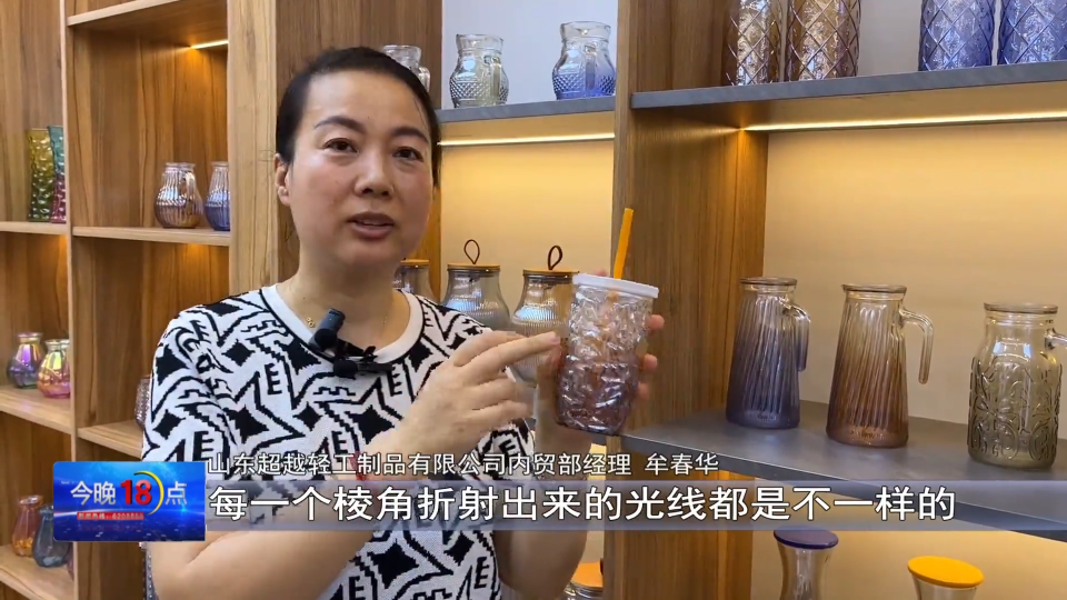 山东超越轻工制品有限公司内贸部经理 牟春华:像我们这个杯子,它就是采用了一个电光水科技,就说这个电光水是要经过1000多度高温烤上去,你看它是有棱有角,每一个棱角折射出来的光线都是不一样的,可能我从这个角度看是紫色,从这个角度看可能就是蓝色,实际上你如果到太阳光底下以后,它会折射出不同颜色变化的。