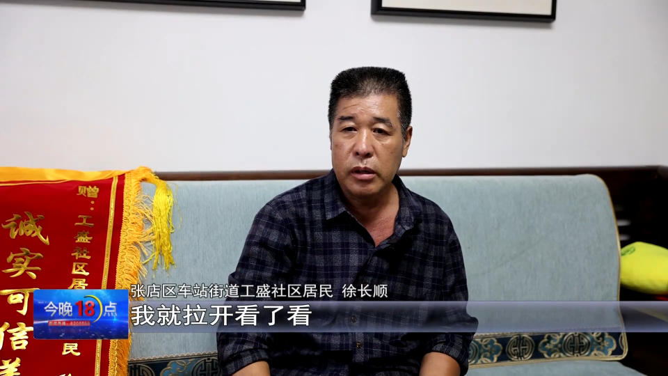 张店区车站街道工盛社区居民 徐长顺:走到十来米,我看见栅栏边上有个包,我就拉开看了看,看着是钱来,当时咱眼也不大很行,也没拿手机也没戴眼镜,等了十来分钟,没有人,我就提着回来了。