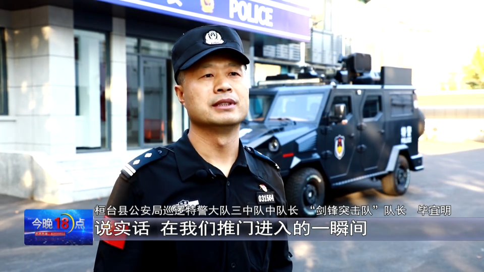接下来是我们栏目的特别策划“我在一线”。我们来认识一位特警,他就是桓台县公安局巡逻特警大队三中队中队长、“剑锋突击队”队长毕宜明。毕宜明曾是一名优秀军人,抢险处突、保家卫国;脱下军装,换上警服,他依然是风雨无惧的钢铁硬汉。从军人到警察,服务对象变了,但永远不变的是保家卫国和保护人民生命财产安的的情怀。